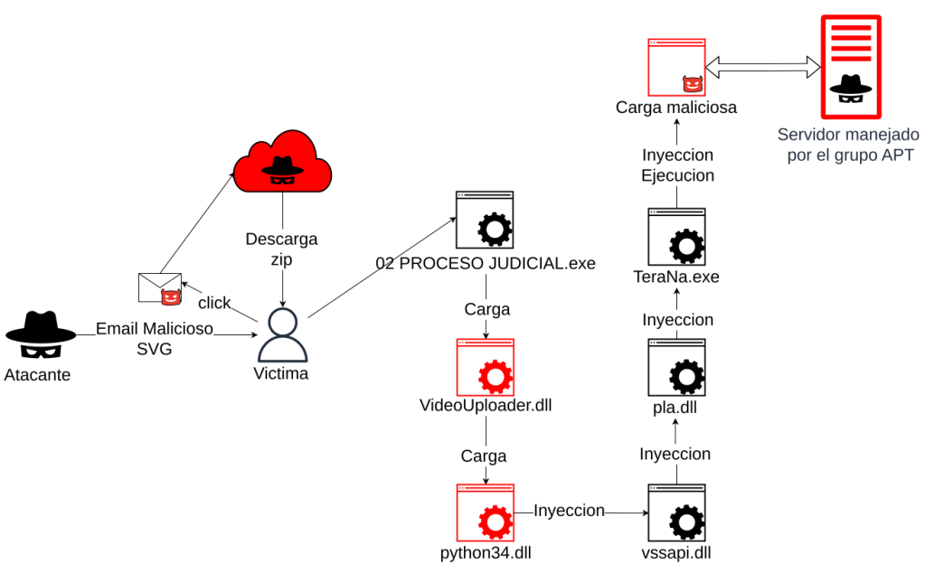 Tanto en este informe como en el anterior, se observa que el actor no ha cambiado mucho su manera de actuar; sus TTPs son los mismos, sigue usando «spear phishing» en las fases iniciales.